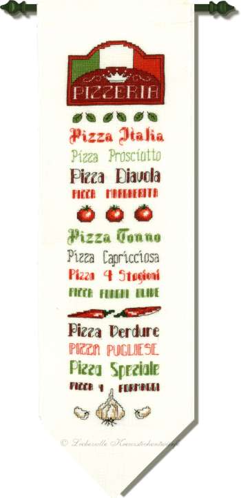 Sehr dekorativ ist die Pizzavielfalt zusammen mit dem farblich passenden Aufhänger.