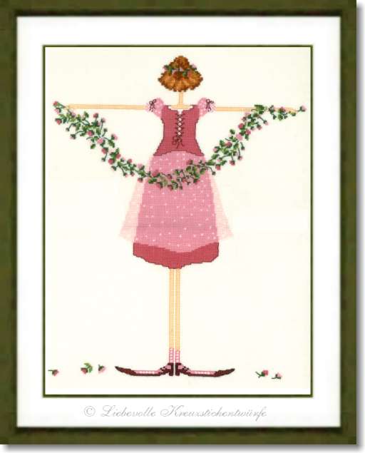 Wer sich den Frühling ins Haus holen möchte, der muß sie einfach sticken, unser Mädchen in den zarten Farben des Frühlings! Toll ist auch die Wirkung des transparenten Rockes. Da wird sicher der eine oder andere Betrachter Sie fragen: wie haben Sie das denn hingekriegt?