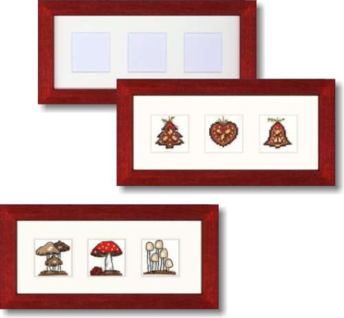Dunkelroter rechteckiger Holzrahmen wahlweise mit Passepartout mit 3 Ausschnitten. Der Rahmen hat eine eckige Leistenform und ein Außenmaß von ca. 23 x 12 cm. Das Passepartout hat drei Ausschnitte von je ca. 3 x 3 cm und ist mit Schrägschnitt gearbeitet. Der Rahmen wird ohne Glas geliefert, kann aber problemlos selbst mit Glas bestückt werden. Perfekt geeignet für unsere 3er Motive Setzen Sie Ihr Lieblingsmotiv in den hübschen Holzrahmen, in unserem Beispiel haben wir die Motive MD-213-16 Lebkuchentrio und MD-214-16 Pilztrio eingerahmt In jedem Fall ein echter Hingucker an Ihrer Wand! Der Rahmen kann quer oder längs gehängt werden. Achtung: Farbabweichungen sind durch die shop Darstellung möglich